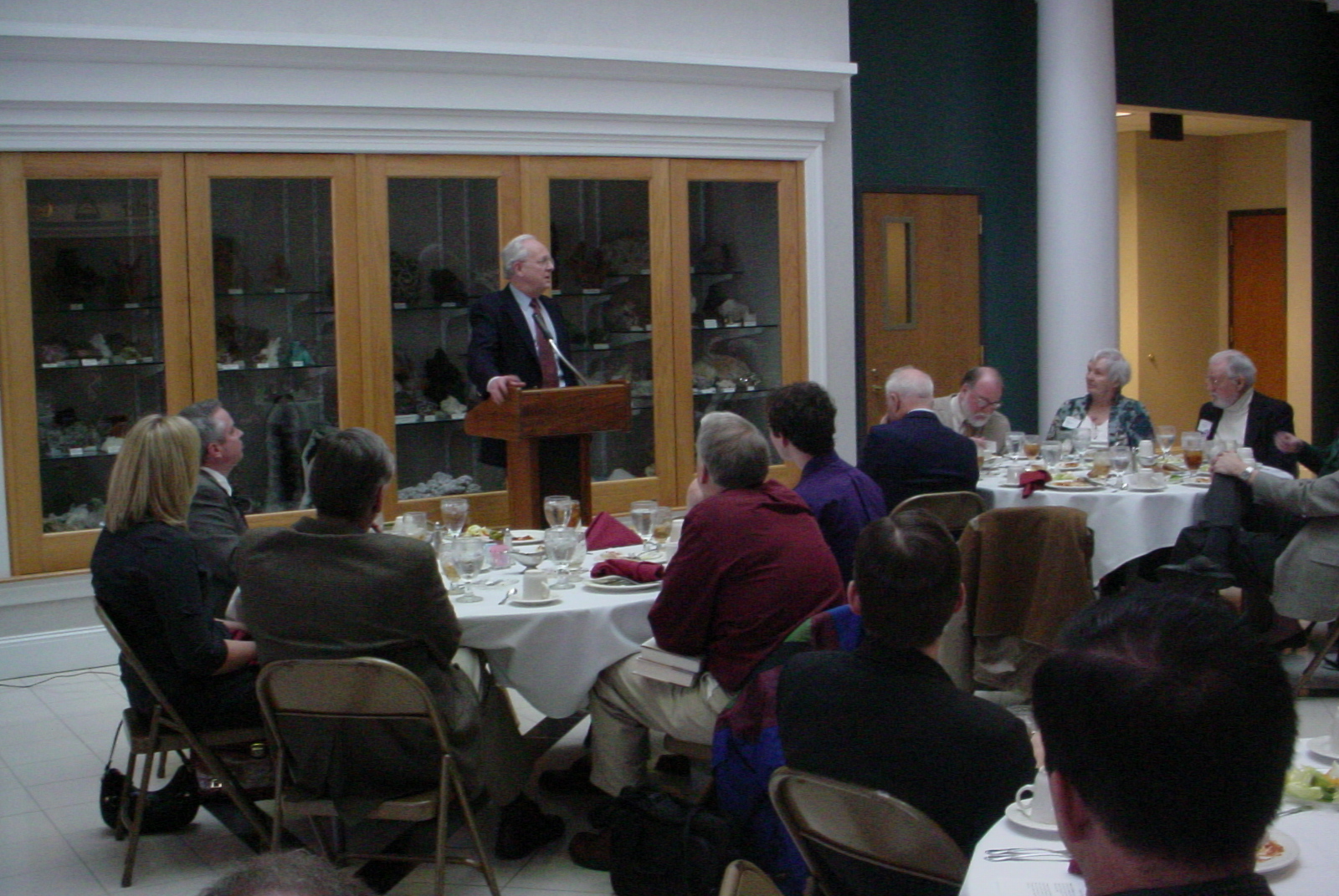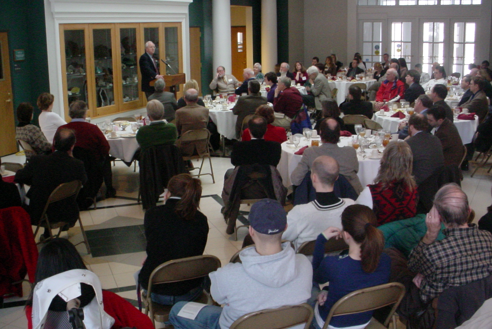 Among the audience for Walter LaFeber (HC '55) are Hanover students Jessica Dowell and Kyle Eriss (at left table) and Betty Gray and Ralph Gray (HC '55), at the right table.